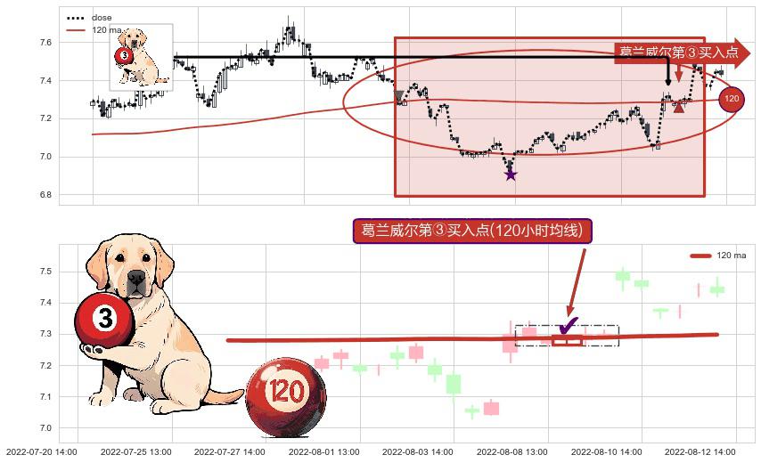形态多维评估: ⚀ 2022-08-08 14:00:00-小时显现 葛兰威尔均线 120小时均线 第③买入点 上升趋势的中继信号,后市看涨,买进信号