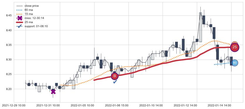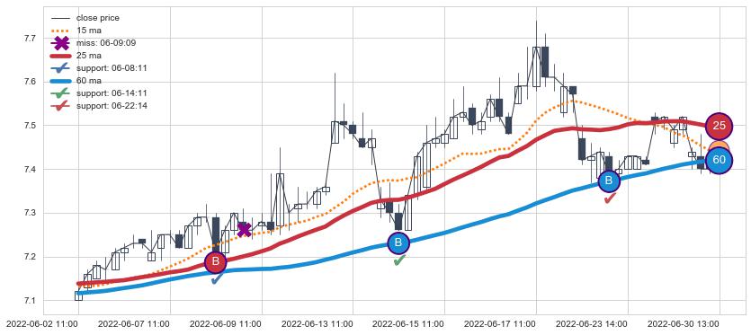 上涨趋势06-02 11:00-06-30 13:00,均线25, 60确认关键支撑3处