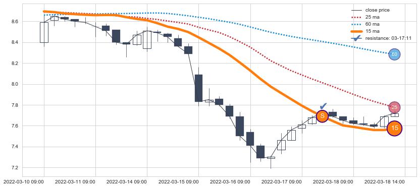下跌趋势03-10 09:00-03-18 14:00,均线15确认关键阻力1处