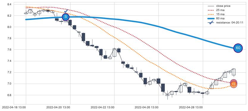 下跌趋势04-18 13:00-05-05 09:00,均线60确认关键阻力1处