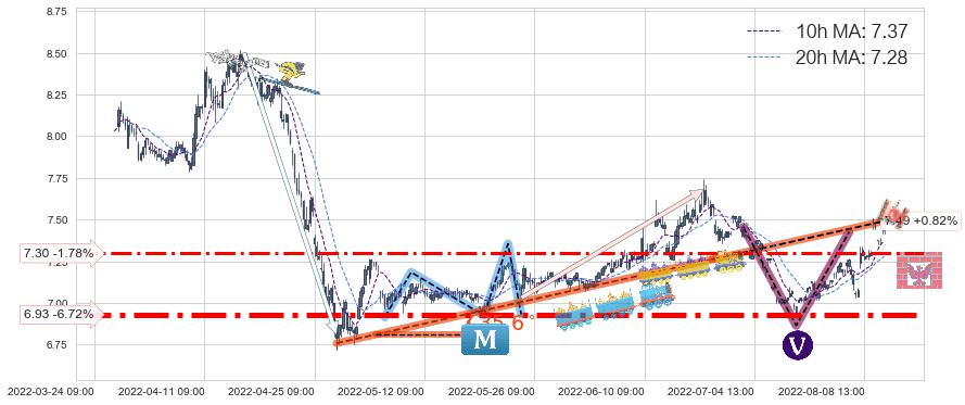 ♘ 支撑价格位7.30,可信任强度62.90%,距离最后交易2022-08-12 14:00形成的收盘价格7.43相差 -1.78%