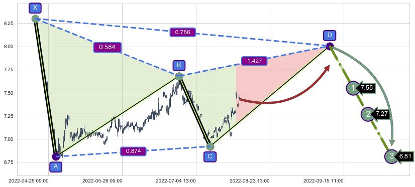 ➢ 距离预测D点位置尚有上涨空间,短线依然【看涨】, 耐心等待看跌【伽利】形态反转启动