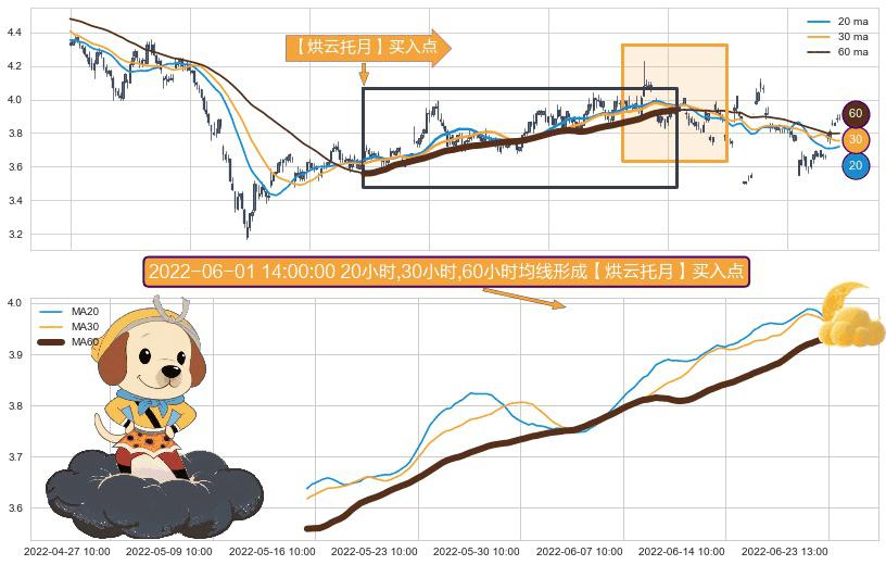 ⚀ 2022-05-13 14:00:00小时-2022-06-24 14:00:00小时显现 20小时-30小时-60小时均线 【烘云托月】买入点 看多信号,后市看涨,买入