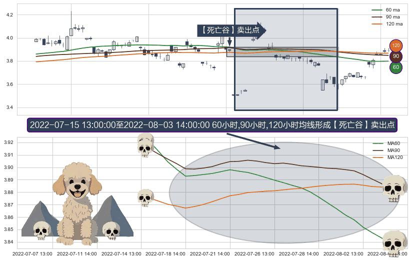 ⚀ 2022-07-15 14:00:00-小时至2022-08-03 14:00:00-小时显现 60小时-90小时-120小时均线 【死亡谷】卖出点 看空信号,后市看跌,卖出