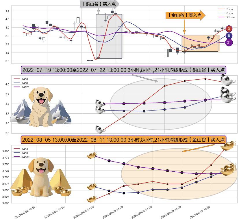 ⚃ 2022-08-05 14:00:00-小时至2022-08-11 13:00:00-小时显现 3小时-8小时-21小时均线 【金山谷】买入点 其再次确认了买入信号,可靠性更强,买入