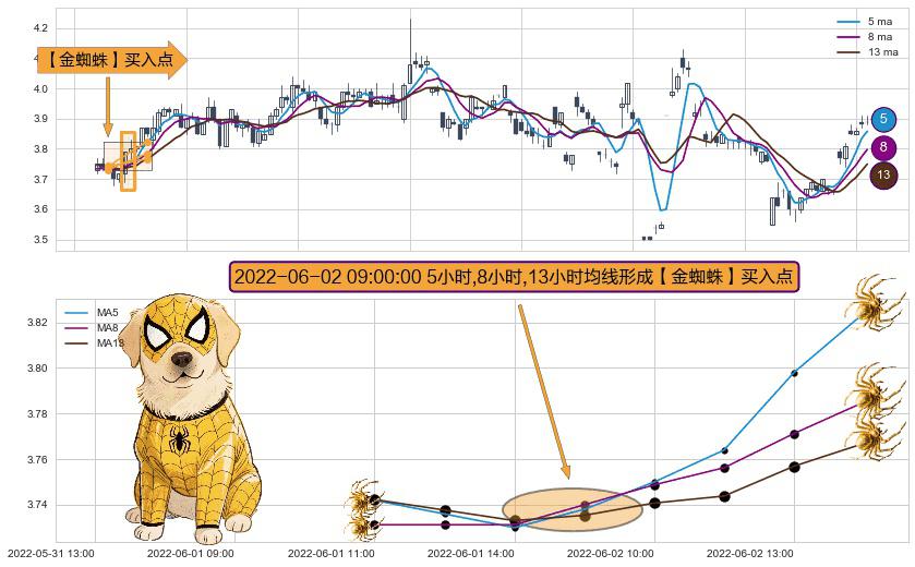 ⚀ 2022-06-02 09:00:00小时显现 5小时-8小时-13小时均线 【金蜘蛛】买入点 看多信号,后市看涨,买入