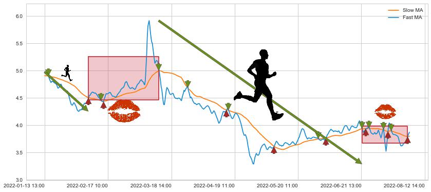 03-14 14:00至06-21 14:00 慢线与快线呈空头排列, 慢线与快线接触少,无缠绕