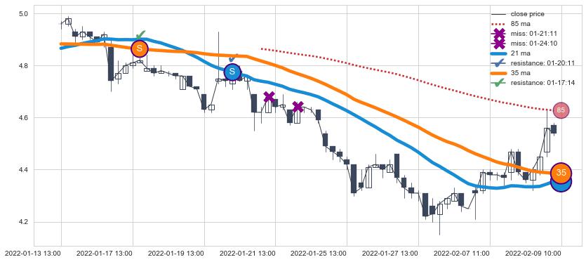 ⚂ 2022-06-22 14:00:00-小时均线向下破位,2022-08-12 13:00:00-小时重新上穿突破均线,均线支撑再次生效