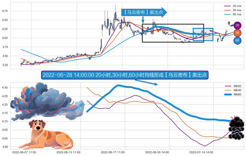 ⚀ 2022-06-14 09:00:00小时-2022-07-21 13:00:00小时显现 20小时-30小时-60小时均线 【乌云密布】卖出点 看空信号,后市看跌,卖出