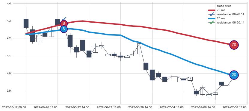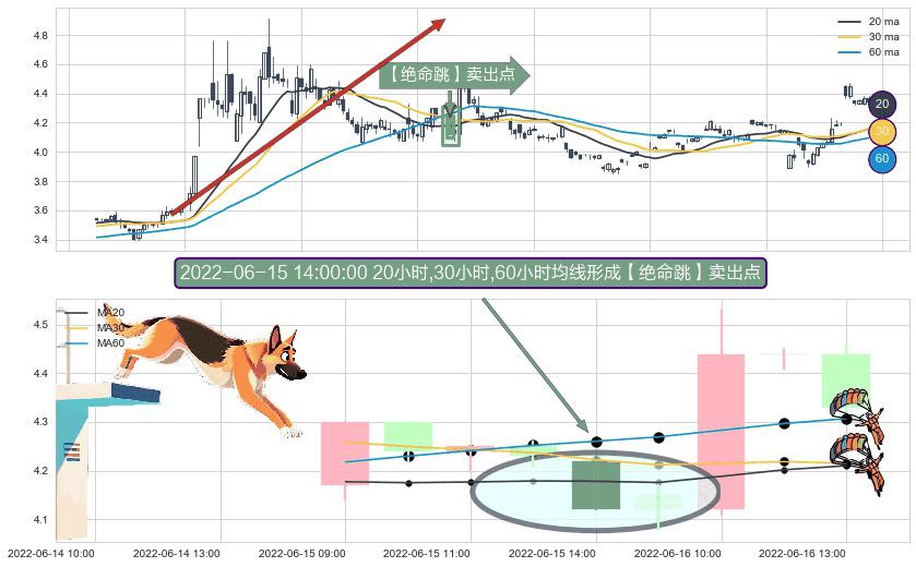 ⚀ 2022-06-15 14:00:00小时显现 20小时-30小时-60小时均线 【绝命跳】卖出点 看空信号,后市看跌,卖出
