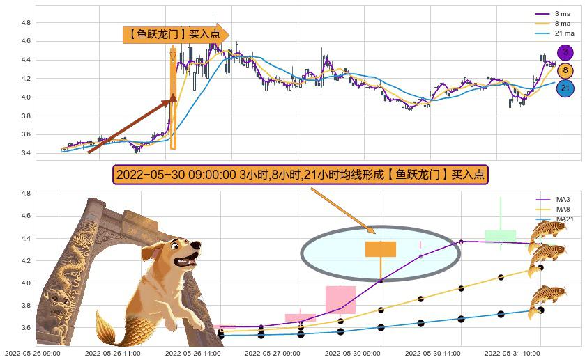 ⚀ 2022-05-30 09:00:00小时显现 3小时-8小时-21小时均线 【鱼跃龙门】买入点 看多信号,后市看涨,买入