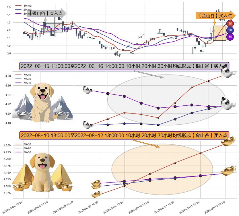 ⚀ 2022-08-10 14:00:00-小时至2022-08-12 13:00:00-小时显现 10小时-20小时-30小时均线 【金山谷】买入点 其再次确认了买入信号,可靠性更强,买入