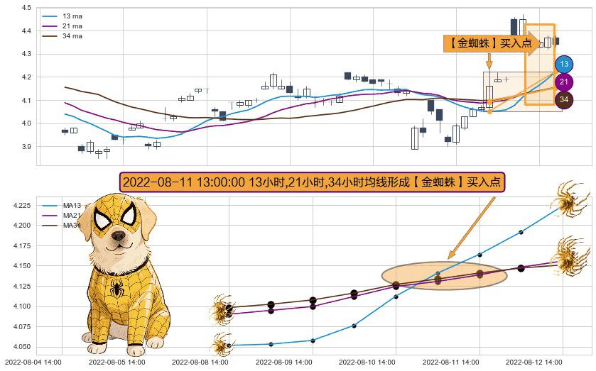 ⚀ 2022-08-11 13:00:00小时显现 13小时-21小时-34小时均线 【金蜘蛛】买入点 看多信号,后市看涨,买入