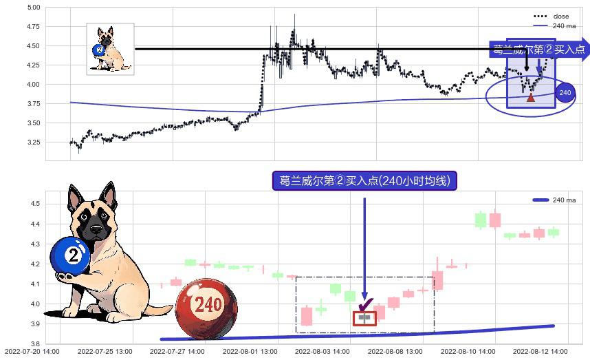 ⚀ 2022-08-04 13:00:00-小时显现 葛兰威尔均线 240小时均线 第②买入点 上升趋势的中继信号,后市看涨,买进信号