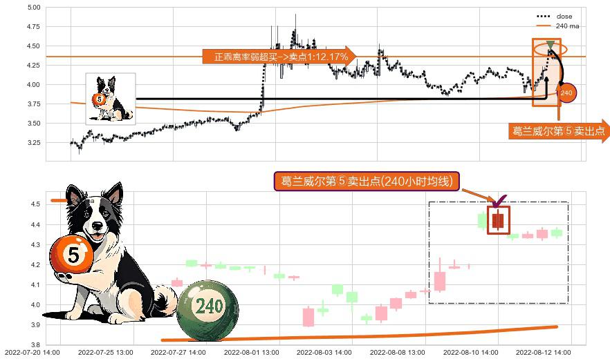 ⚀ 2022-08-10 14:00:00-小时显现 葛兰威尔均线 240小时均线 第⑤卖出点 上升趋势均值回复的短线回落信号,后市看跌,卖出信号