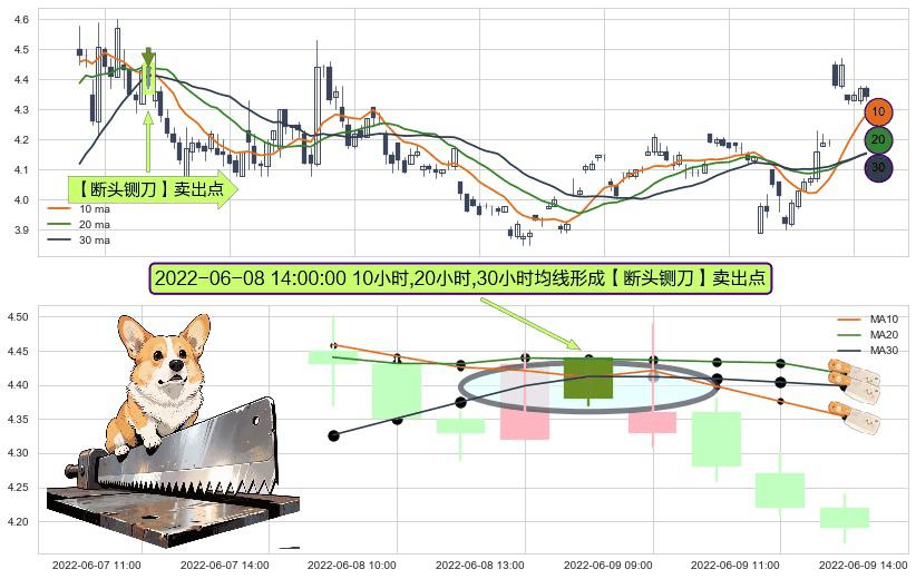 ⚀ 2022-06-08 14:00:00小时显现 10小时-20小时-30小时均线 【断头铡刀】卖出点 看空信号,后市看跌,卖出