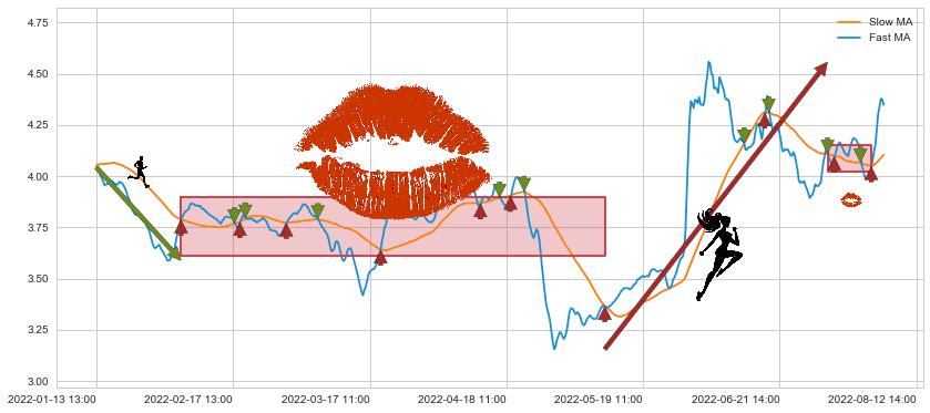07-15 13:00至08-08 13:00 慢线与快线多次接触,存在上下穿越,有缠绕