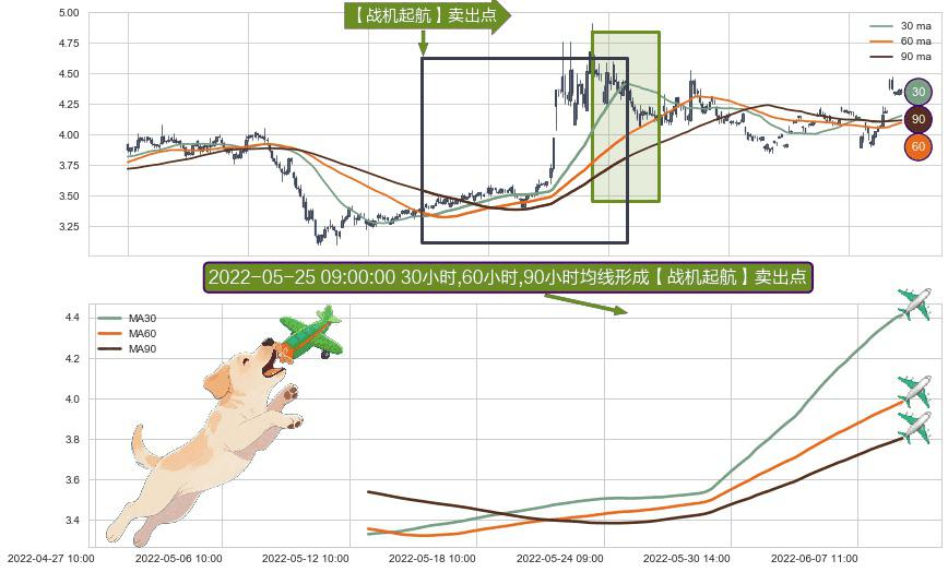 ⚀ 2022-05-12 14:00:00小时-2022-06-08 14:00:00小时显现 30小时-60小时-90小时均线 【战机起航】卖出点 看空信号,后市看跌,卖出