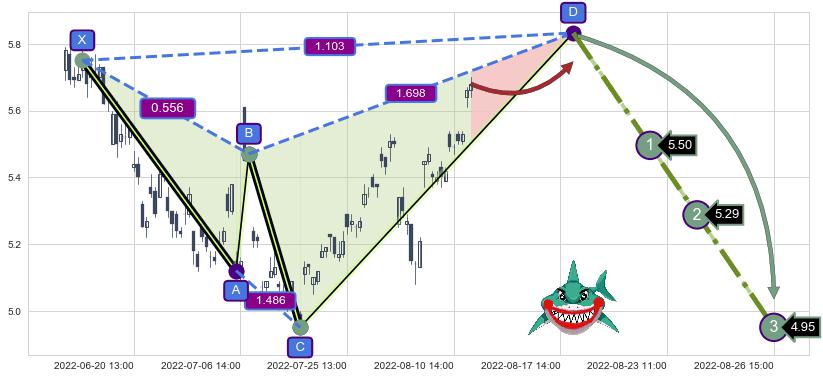 ➢ 接近预测D点位置, 随时警戒看跌【鲨鱼】形态反转启动