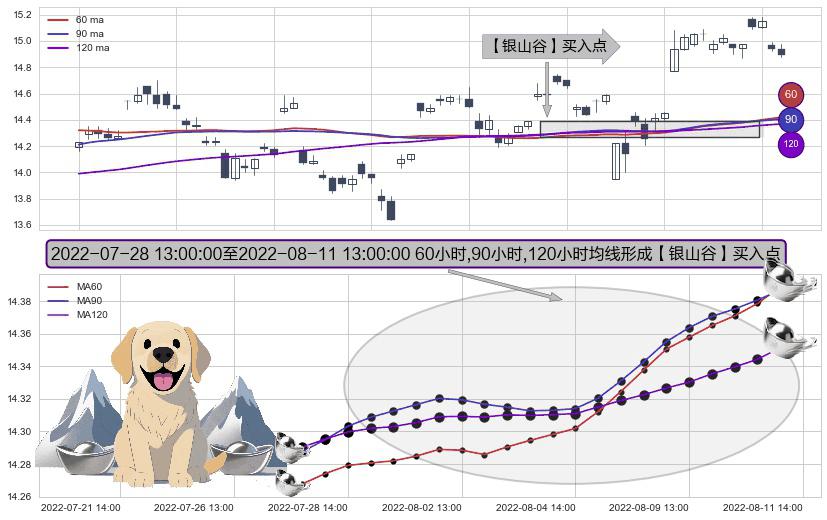 ⚀ 2022-07-28 14:00:00-小时至2022-08-11 13:00:00-小时显现 60小时-90小时-120小时均线 【银山谷】买入点 看多信号,后市看涨,买入