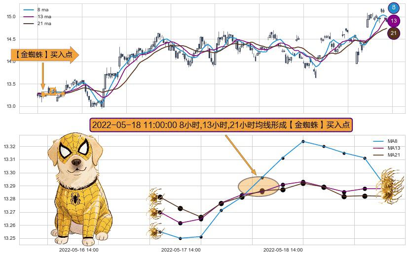 ⚀ 2022-05-18 11:00:00小时显现 8小时-13小时-21小时均线 【金蜘蛛】买入点 看多信号,后市看涨,买入