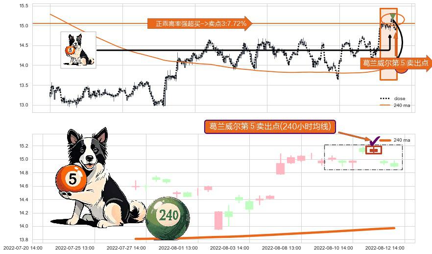 ⚀ 2022-08-11 14:00:00-小时显现 葛兰威尔均线 240小时均线 第⑤卖出点 上升趋势均值回复的短线回落信号,后市看跌,卖出信号