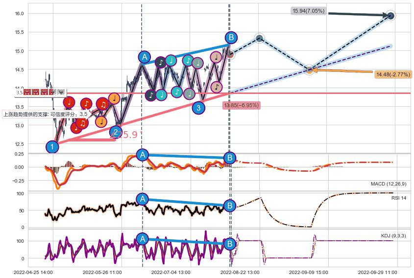 ♘ 支撑价格位14.70,可信任强度77.55%,距离最后交易2022-08-12 14:00形成的收盘价格14.89相差 -1.26%