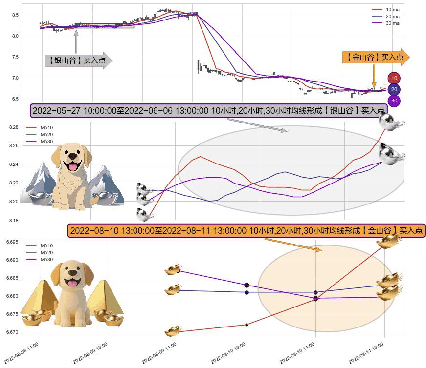⚃ 2022-08-10 14:00:00-小时至2022-08-11 13:00:00-小时显现 10小时-20小时-30小时均线 【金山谷】买入点 其再次确认了买入信号,可靠性更强,买入