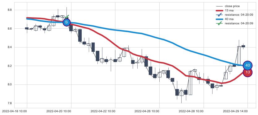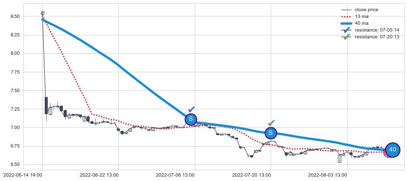 ⚂ 2022-06-02 14:00:00-小时均线向上突破,2022-06-15 09:00:00-小时重新下穿均线破位,均线阻力再次生效