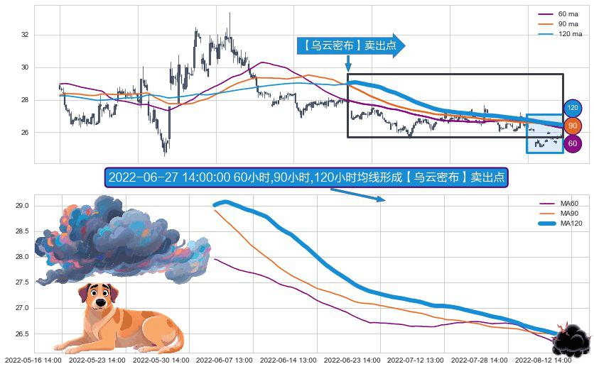 ⚀ 2022-06-01 14:00:00小时-2022-08-12 14:00:00小时显现 60小时-90小时-120小时均线 【乌云密布】卖出点 看空信号,后市看跌,卖出