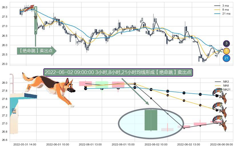 ⚀ 2022-06-02 09:00:00小时显现 3小时-8小时-21小时均线 【绝命跳】卖出点 看空信号,后市看跌,卖出