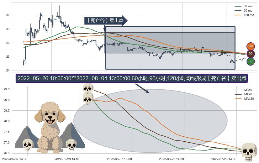 ⚀ 2022-05-26 11:00:00-小时至2022-08-04 13:00:00-小时显现 60小时-90小时-120小时均线 【死亡谷】卖出点 看空信号,后市看跌,卖出