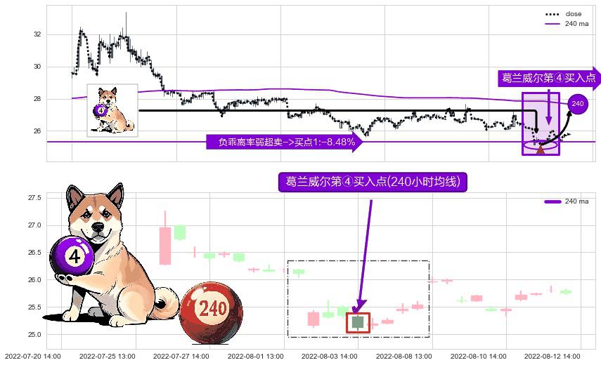 ⚀ 2022-08-03 14:00:00-小时显现 葛兰威尔均线 240小时均线 第④买入点 下降趋势均值回复的短线反弹信号,后市看涨,买进信号