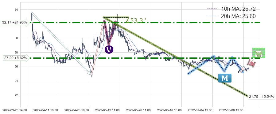 ♘ 阻力价格位27.20,可信任强度83.46%,距离最后交易2022-08-12 14:00形成的收盘价格25.75相差 +5.62%