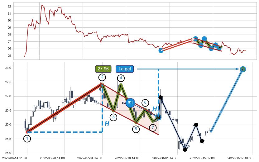 ➣ 收盘价(07-25:14: 26.35 )→回踩→第一根k线低点(07-21:14: 26.30 )