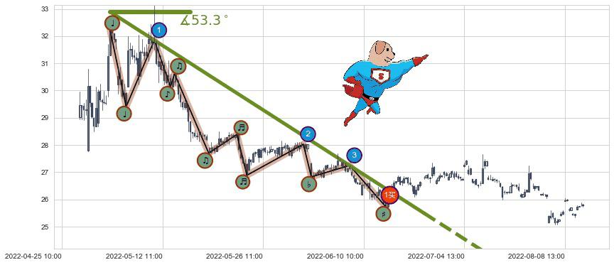 ⚔️ 2022-05-05 10:00-2022-06-20 13:00下跌趋势存在反转上涨[机会],其原下跌趋势的阻力位(21.75)已被突破[强支撑信号],原下跌趋势角度: 53.3˚