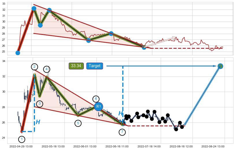 ➢ 【买1】: 激进型 买点 →(06-14:13: 25.92 )形成突破降🚩楔型【整理】形态