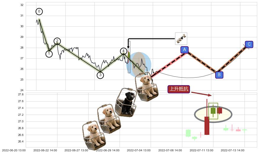 | 3 🅚:早晨之星(黎明之星) ➕ 🌊:波浪理论猜想下跌浪5已形成,猜想后续形成abc反弹上涨(均值回复) ☞ 看多信号 ⇥ 【🅚线】交织【图形】⇥ 综合量化分数: 51 | > |