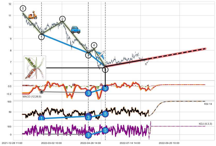➢ 1,3,5驱动浪MACD, RSI, KDJ走势都出现【常规背离】反转信号增强