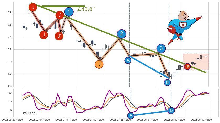 从2022-06-28 14:00至2022-08-11 13:00,共包含64个小时,阶段股价下跌-9.94%,阶段股价变动位移路程比: 1 : 5,下跌趋势角度: 43.8,2022-08-02 13:00向↘︎形成缺口,跳空下跌-4.07%˚