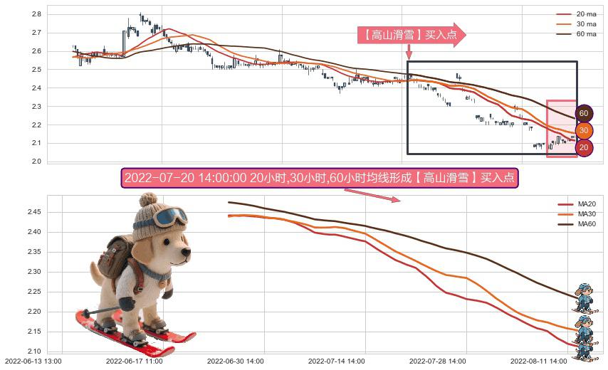 ⚀ 2022-06-27 13:00:00小时-2022-08-12 14:00:00小时显现 20小时-30小时-60小时均线 【高山滑雪】买入点 看多信号,后市看涨,买入
