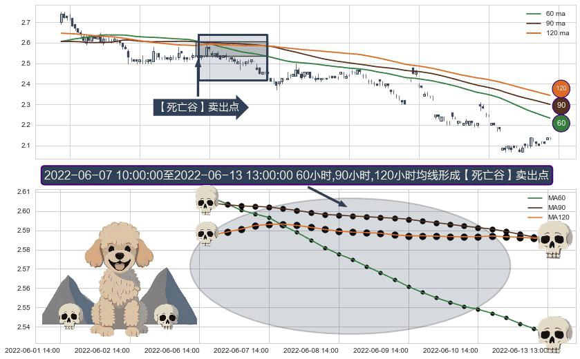 ⚀ 2022-06-07 11:00:00-小时至2022-06-13 13:00:00-小时显现 60小时-90小时-120小时均线 【死亡谷】卖出点 看空信号,后市看跌,卖出