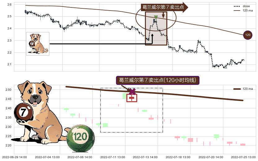 ⚀ 2022-07-11 14:00:00-小时显现 葛兰威尔均线 120小时均线 第⑦卖出点 下降趋势的中继信号,后市看跌,卖出信号