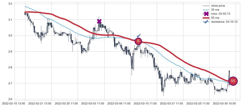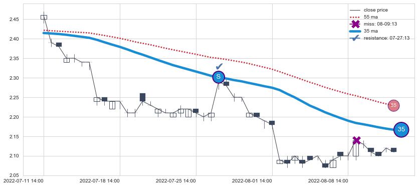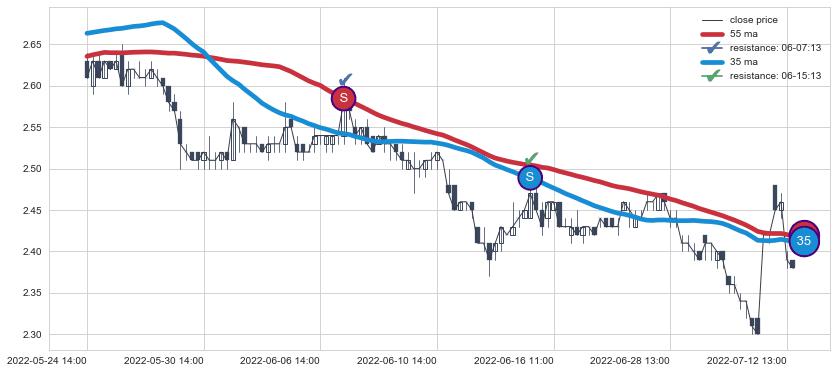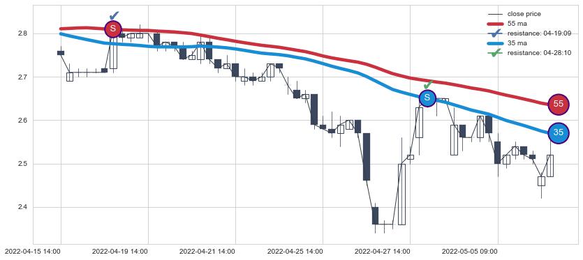 ⚂ 2022-05-18 11:00:00-小时均线向上突破,2022-05-24 09:00:00-小时重新下穿均线破位,均线阻力再次生效