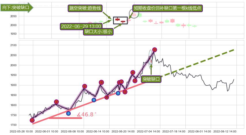 ➣ 2022-05-26 10:00-2022-07-01 14:00上升趋势存在反转[风险],其原上升趋势的支撑位(2076.38)已破位[强阻力信号],原上升趋势角度: 46.8˚