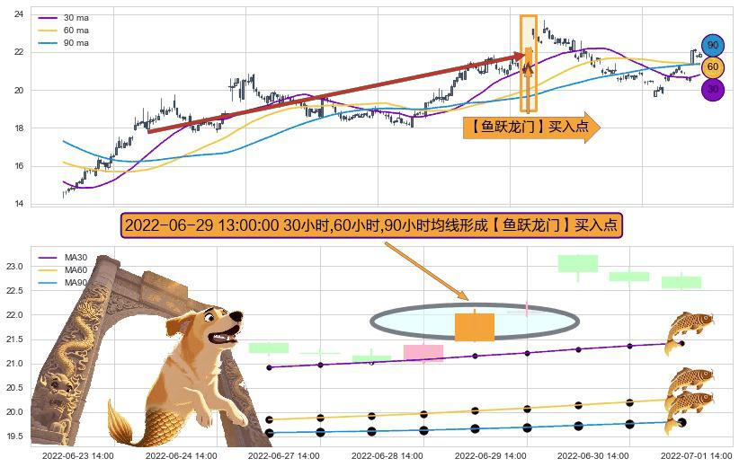 ⚀ 2022-06-29 13:00:00小时显现 30小时-60小时-90小时均线 【鱼跃龙门】买入点 看多信号,后市看涨,买入