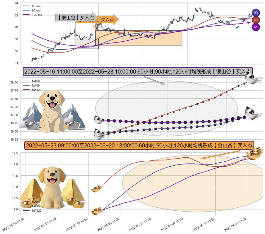 ⚃ 2022-05-23 10:00:00-小时至2022-06-20 13:00:00-小时显现 60小时-90小时-120小时均线 【金山谷】买入点 其再次确认了买入信号,可靠性更强,买入