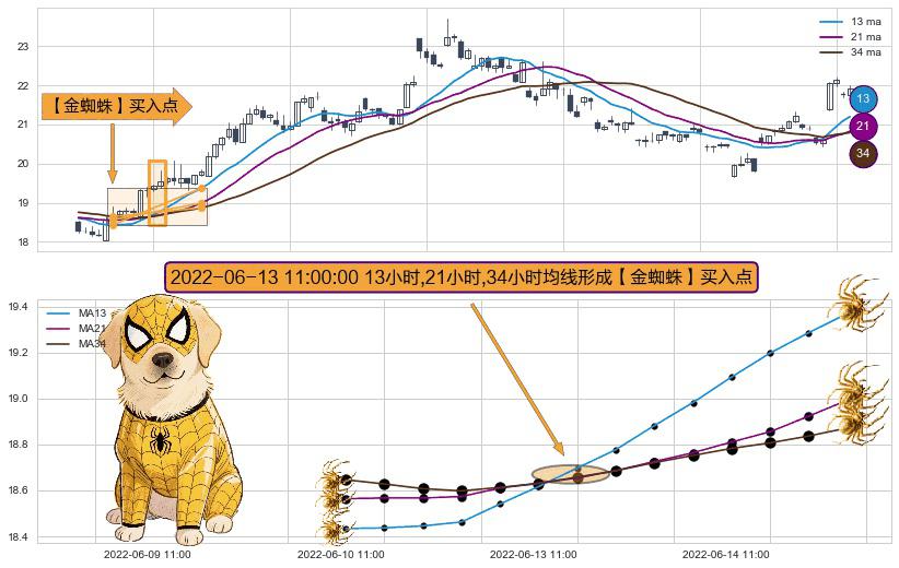 ⚀ 2022-06-13 11:00:00小时显现 13小时-21小时-34小时均线 【金蜘蛛】买入点 看多信号,后市看涨,买入