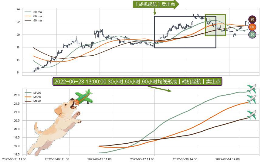 ⚀ 2022-06-10 10:00:00小时-2022-07-18 14:00:00小时显现 30小时-60小时-90小时均线 【战机起航】卖出点 看空信号,后市看跌,卖出