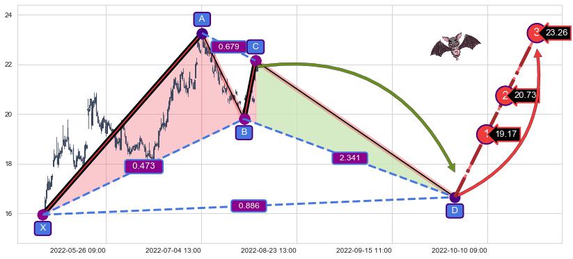 ➢ 距离预测D点位置有足够的下跌空间, 与看涨【蝙蝠】形态相反,实际方向【看跌】